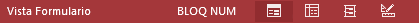 Por ejemplo aquí nos indica que tenemos la tecla de teclado numérico pulsada (BLOQ NUM), que estamos en la vista Formulario y podemos cambiar la vista a Hoja de datos, Presentación y Diseño con los cuatro botones que aparecen a la derecha. Los nombres de los botones se muestran en un pequeño cuadro informativo al dejar el cursor sobre uno de ellos, de forma que no es necesario que los memorices. Con el uso ya irás aprendiendo la forma de los botones que más utilices.