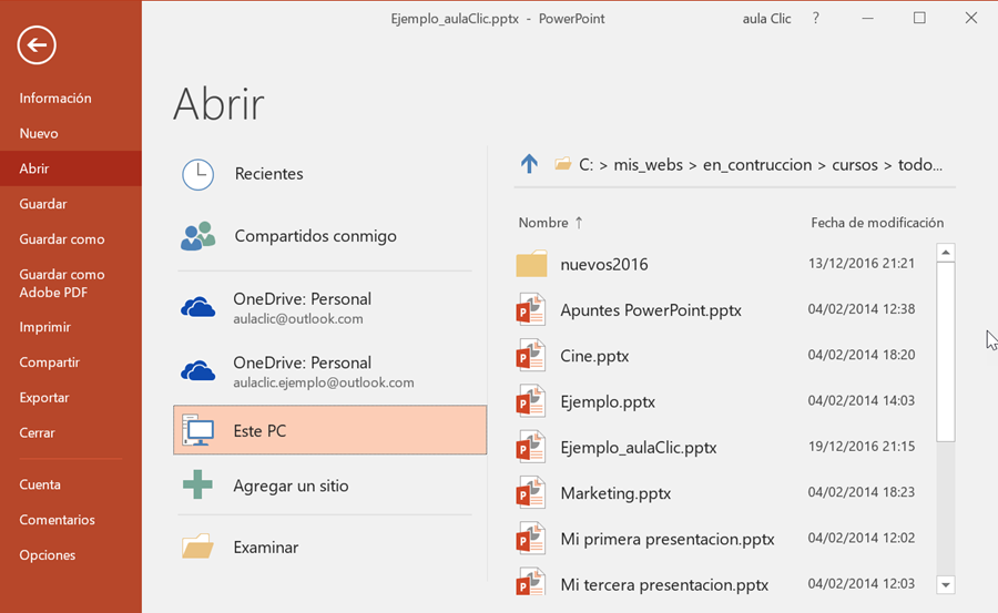 Una vez hemos creado y guardado una presentación, ya la tendremos almacenada en el equipo o en OneDrive. Bien, y ahora, ¿cómo la abrimos si queremos verla o seguir editándola? Existen varias formas de abrir una presentación, de momento nos vamos a centrar en dos maneras de recuperar un fichero que haya sido guardado en el equipo: desde PowerPoint localizándola manualmente en su carpeta contenedora y desde la lista de archivos recientemente utilizados. Para ambas vías, en primer lugar debemos recurrir a la opción Archivo > Abrir o a las teclas rápidas CTRL+A. Dicha acción inicia el siguiente cuadro de diálogo: