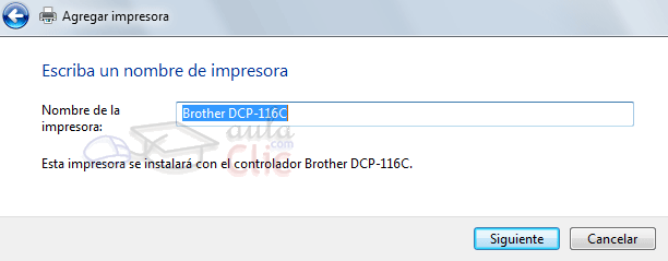 4. Escribimos el nombre que queramos darle a la impresora o dejamos el que viene por defecto y pulsamos Siguiente.