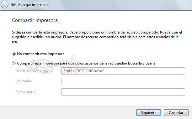 5. Elegimos si queremos conectar esta impresora en red. Nosotros no la vamos a compartir, pero si así fuese podríamos añadir información descriptiva sobre ella.