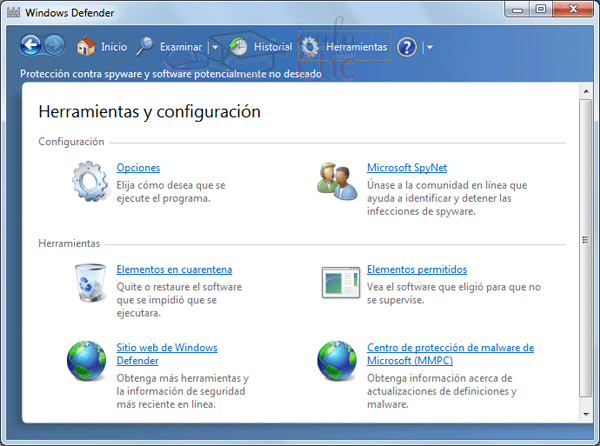 Además, encontrarás también la opción Windows Defender. Se trata de un programa antiespías incluido desde Windows Vista. Puedes activarlo o dejar que otro programa se encargue de la tarea.