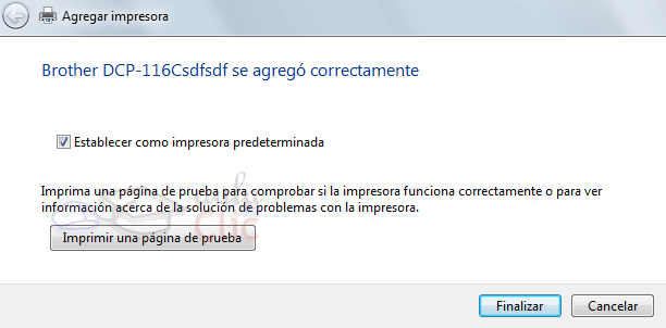 6. Decidimos si queremos que esta sea la impresora predeterminada, es decir, si en caso de no especificar nada se imprimirá por ella. Para asegurarnos de su correcto funcionamiento, podemos pulsar en Imprimir una página de prueba. Al pulsar Finalizar, ya dispondremos de la impresora.