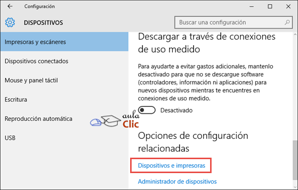Debemos hacer notar que esta lista nos permite una administración básica de nuestras impresoras instaladas y, en la mayoría de los casos, será suficiente para el trabajo cotidiano con nuestro equipo. Sin embargo, si requerimos de modificar más a fondo sus propiedades, entonces debemos utilizar la opción Dispositivos e impresoras que aparece más abajo aún en la misma ventana bajo el rubro Opciones de configuración relacionadas.