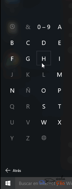 Como puede verse, hay una barra lateral que podemos desplazar para recorrer la lista de aplicaciones y seleccionar la deseada. Sin embargo, cuando el número de aplicaciones o programas instalados es muy alto, llegar a uno en específico a través de la lista puede ser una labor tediosa. Por ello, hay un pequeño atajo en esta lista. Si hacemos clic en cualquier letra de las que dividen los programas, obtendremos un alfabeto. Ahí podemos pulsar a su vez cualquier letra y nos llevará a los programas que comienzan con la misma. De este modo, conociendo el nombre del programa deseado, podremos llegar rápidamente a él. Obviamente, las letras que aparecen desvanecidas no tienen ninguna aplicación cuyo nombre inicie con ella.