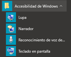 Al pulsar sobre el tìtulo veremos la lista de aplicaciones a las que podremos acceder con un nuevo clic. De este modo se reducen los ìtem del menú Inicio y muchas aplicaciones quedan agrupadas lògicamente, como en el caso del menú Accesibilidad de Windows que podemos ver en la siguiente imagen.