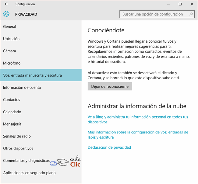 Otro aspecto de la privacidad que hemos dejado al final tiene que ver no sólo con los datos que nos definen de algún modo, como nuestra ubicación, nombre y lista de contactos, sino también con la información que dinámicamente generamos. Por ejemplo, qué páginas visitamos de internet, qué compramos, a quién le escribimos con más frecuencia, en dónde estudiamos o trabajamos, etcétera. Estas opciones implican una recolección permante de información relacionada con nuestras actividades. Para muchas personas es común que esa información la brinden voluntariamente a través de las redes sociales. En el caso de Microsoft y Windows 10, hay una opción llamada Conociéndote que se encuentra en el cuadro de diálogo anterior, en la categoría Voz, entrada manuscrita y escritura. Esta opción puede desactivarse pulsando el botón Dejar de conocerme. Luego tendremos que usar la opción Ve a Bing y administra tu información personal en todos tus dispositivos para eliminar la información que ya esté almacenada en la nube.