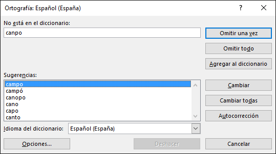 En caso de encontrar algún posible error ortográfico, aparecerá el cuadro de diálogo Ortografía.