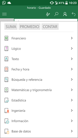 Si pulsamos el botón de inserción de fórmula (situado en la segunda línea, a la izquierda), veremos desplegado un menú asistente con la mayoría de fórmulas disponibles en la versión de escritorio clasificadas por categorías: