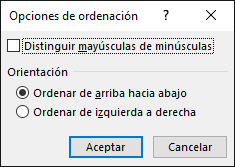 En la parte superior derecha tenemos un botón Opciones... que sirve para abrir el cuadro Opciones de ordenación donde podremos especificar más opciones en el criterio de la ordenación.