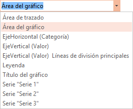 Para modificar un elemento primero deberemos seleccionarlo. Podemos hacerlo como siempre, haciendo clic directamente sobre él en el gráfico. O podemos ayudarnos de una herramienta muy útil que nos permite seleccionarlo de un listado. Dicho listado se encuentra en el grupo Selección actual.